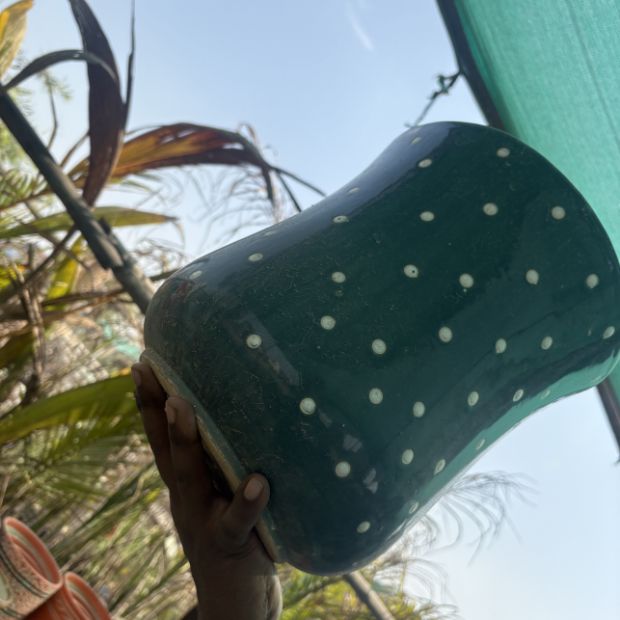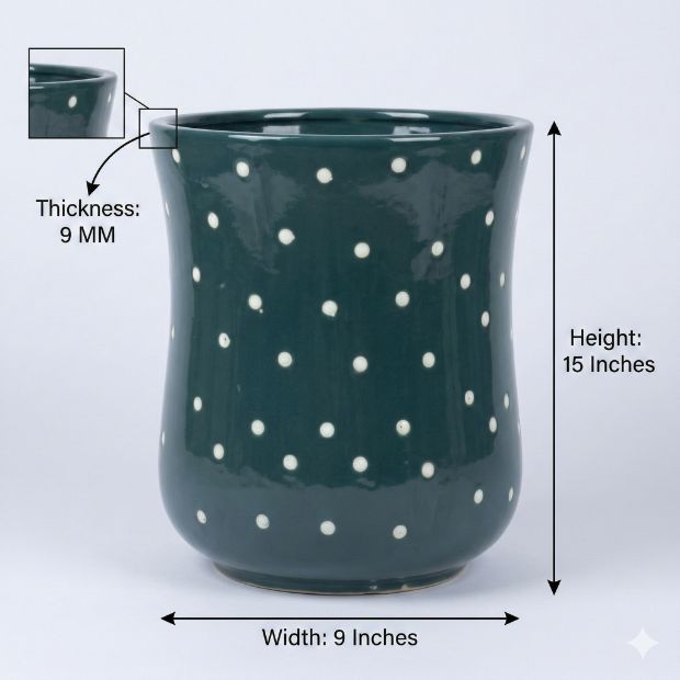 Elevate your interior styling with this striking teal ceramic planter, designed with a graceful hourglass silhouette and accented with soft mint polka dots. The high-gloss glaze enhances its depth of color while reflecting natural light beautifully.