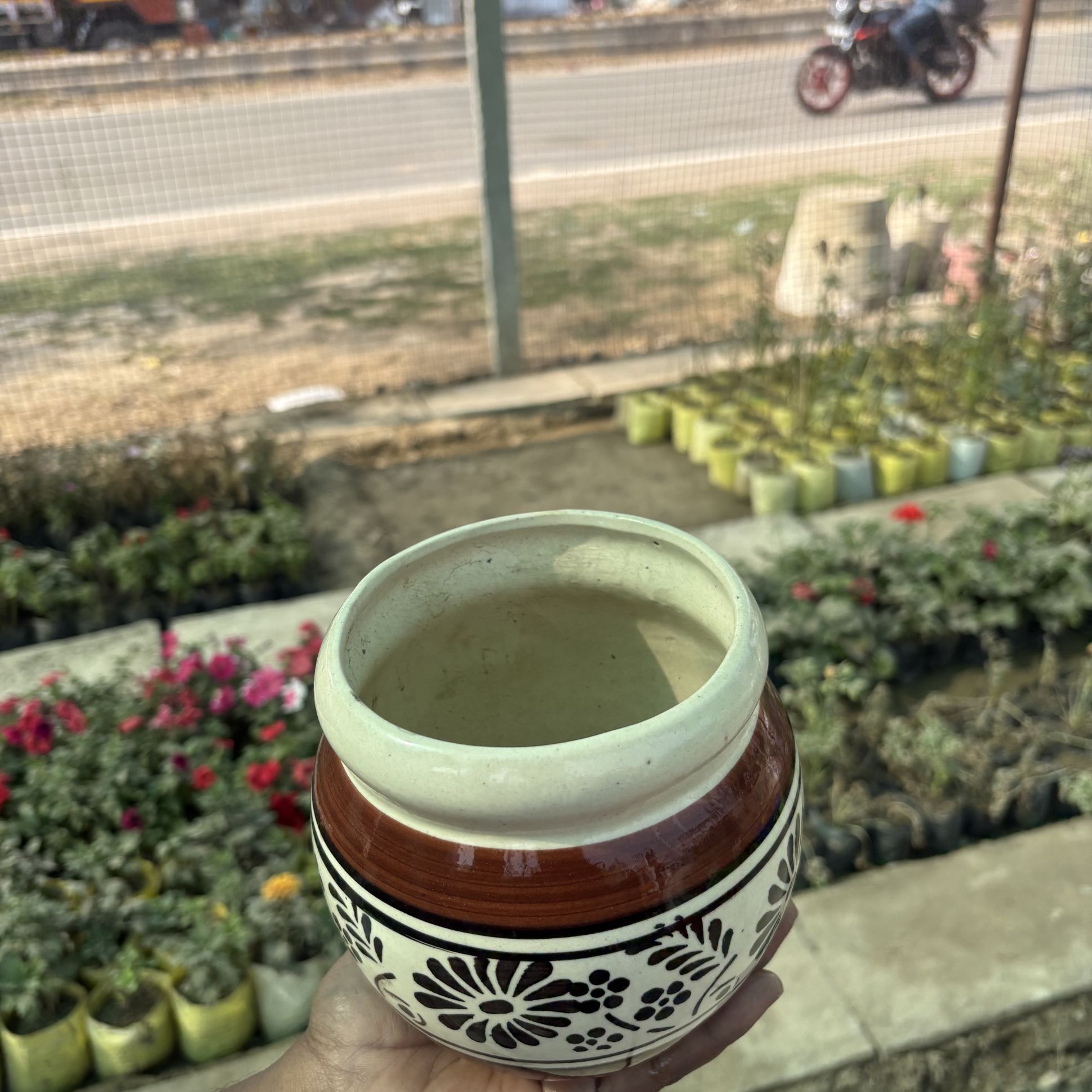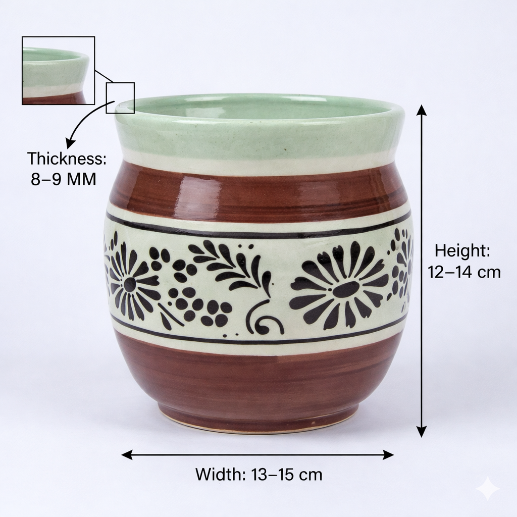 Bring artisanal warmth into your home with this handcrafted ceramic storage jar. Designed with a rounded silhouette and finished in rich terracotta brown and soft cream tones, the piece is wrapped in a bold hand-painted floral motif that adds character and cultural charm.